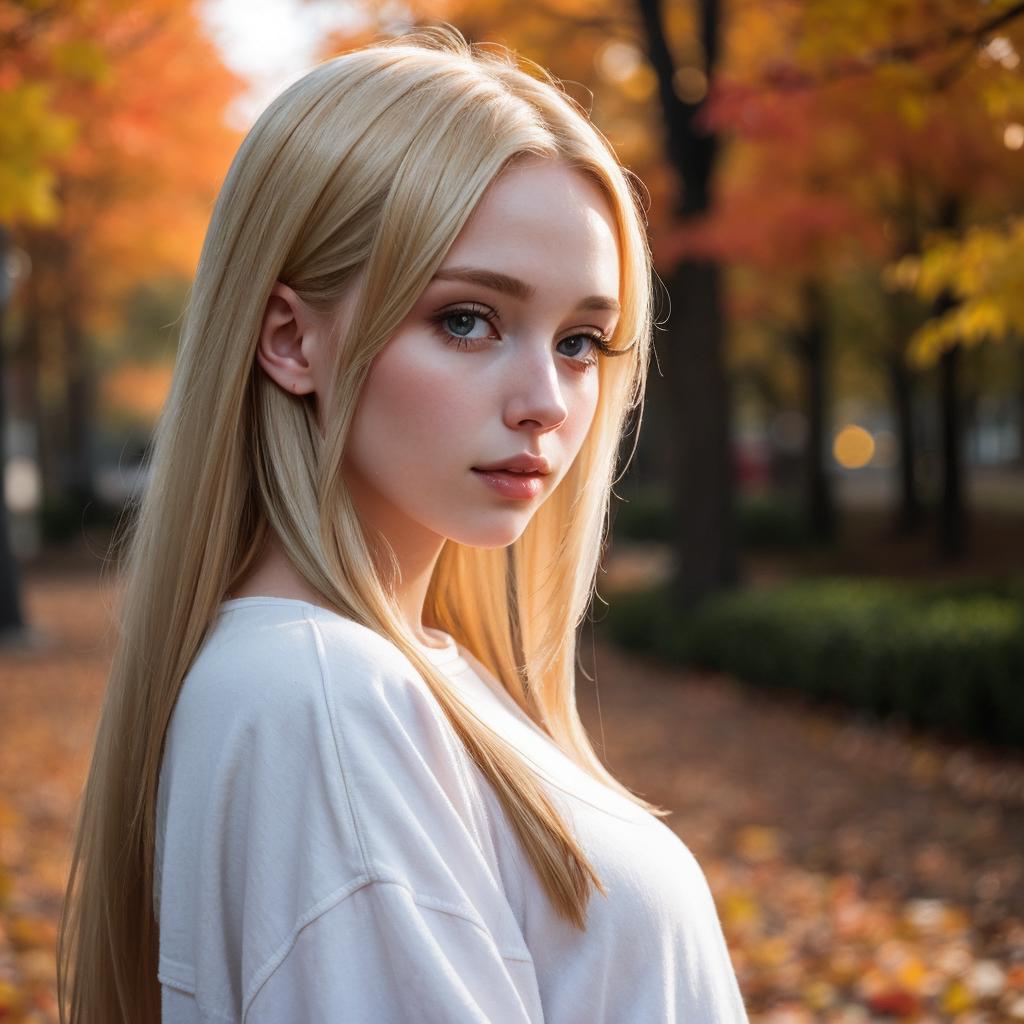 beautiful girl wearin in oversized clothes points her finger at the viewer, long blonde hair, (upper body:1.2), autumn leaves, outdoors, volumetric light, cinematic, golden hour, natural lighting, natural lighting,