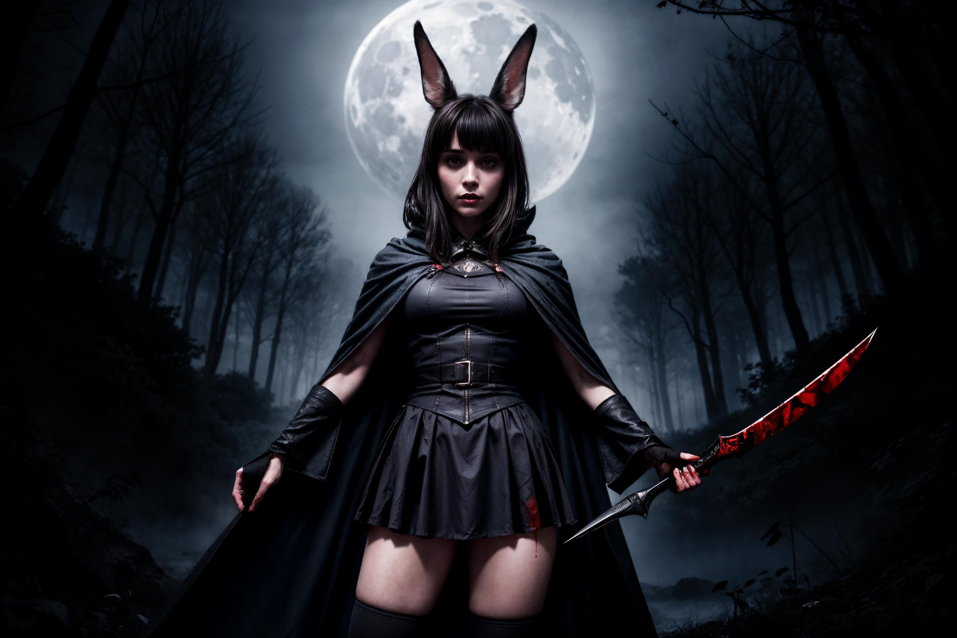 AS-YoungV2, The cute madness curvy rabbit-girl is depicted in full height, standing on its hind legs, with a threatening expression on its face. her coat has a dark gray shade, which creates an atmosphere of mystery and danger. The killer rabbit-girl is dressed in a (black cloak stained with blood:1.3), which gives her mystery and inaccessibility. In her front paws he holds a weapon – a knife or a dagger, which is a symbol of his cruelty and ruthlessness. She is ready for action, her eyes are full of an ominous gleam, and his mustache is directed downwards, creating the effect of tension and readiness to attack.