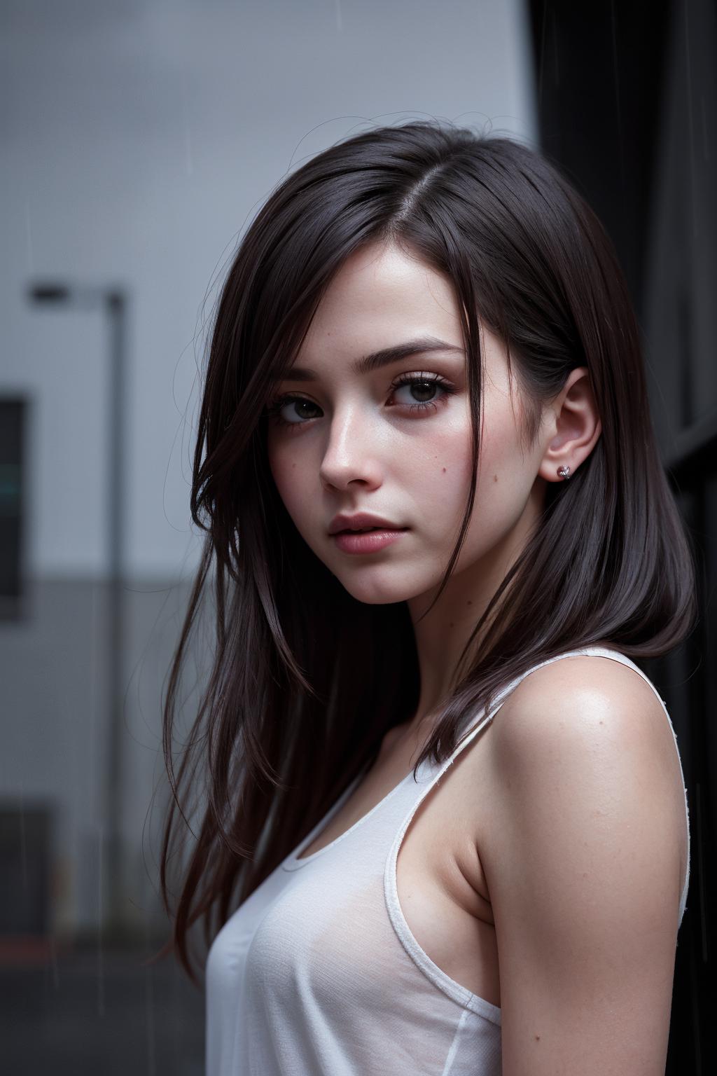 (dynamic angle:1.1), (cute face:1.2), dark sky, (nighttime:1.2), (rainy weather:1.2), detailed skin texture, photo of angry girl in the street, looking to the side, wet hair, volumetric light, masterpiece, best quality, intricate details, subsurface scattering