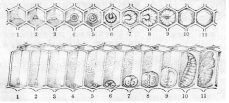 工蜂的发育阶段(数字表示日期)1~3卵  4~9未封盖幼虫    10封盖幼虫  11蛹