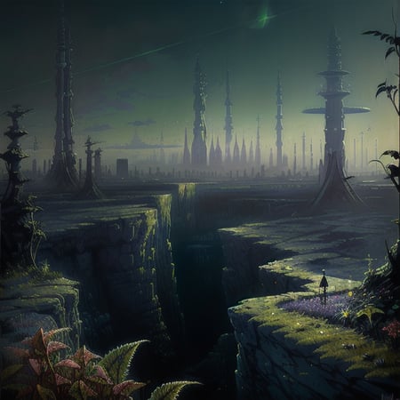 触发词:cosmiclandscapes,alien landscape,retro,mysterious,alien plants,strange growths,strange rock formations,desert,barren planet,lake,river