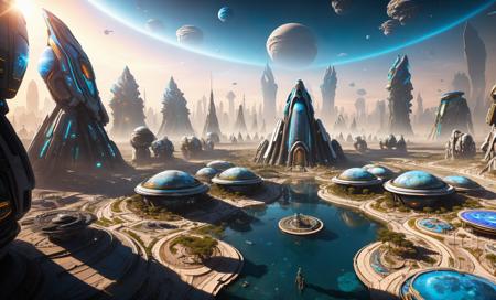 UHD, anatomically correct, textured skin, ccurate, super detail, high details, award winning, best quality, high quality,future world,city in an oasis, Science and technology sense architecture, A giant robot, There are two planets in the sky, Tiny human beings., The sun is on the horizon, Colorful sunset ,<lora:Tesseract_2.0:1>