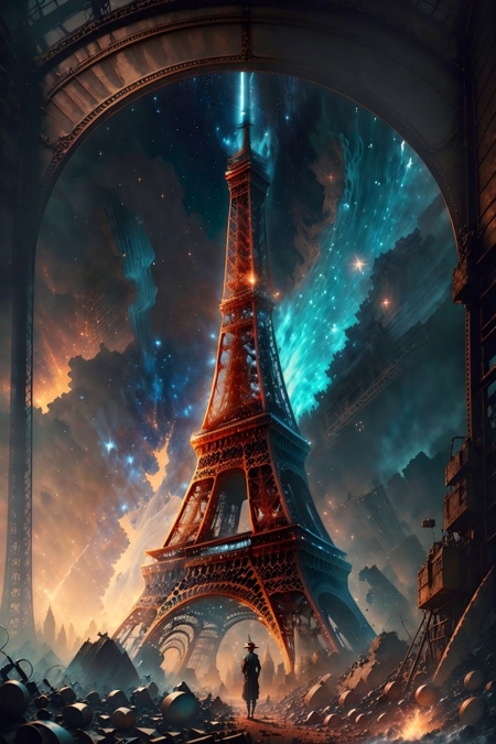 fantasy00d, (art by John French Sloan:0.7), (art by Frank Cho:0.7), (art by Charles Ginner:0.8), Color splash, ground level shot of a Shabby Welding machine, inside a 1920’S Eiffel Tower, Stars in the sky, FOV 90 degrees, Anime screencap, Surprising, waning light, <lora:fantasy00d-000015:1>
