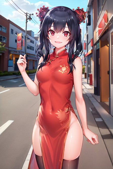 (masterpiece, best quality:1.2), <lyco:chanthology_corona-chan-10:1.0>, cowboy shot, solo, 1girl, corona-chan, smile, looking at viewer, double bun, red eyes, chinese clothes, china dress, thighhighs