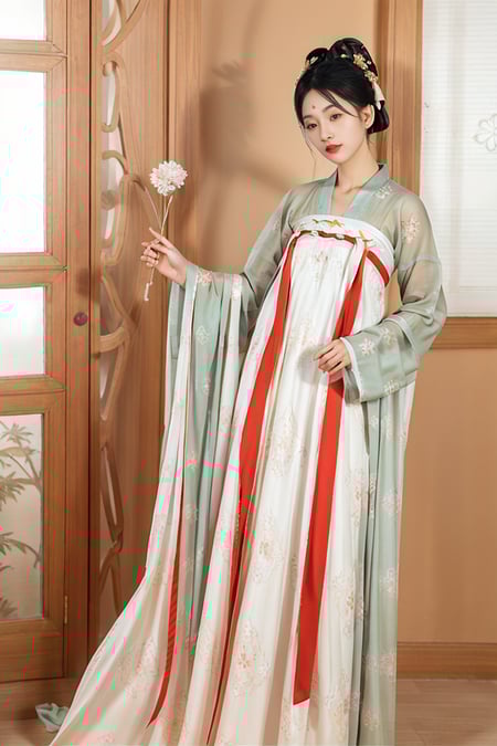 xtremely detailed CG unity 8k wallpaper,(masterpiece),(best quality),(ultra detailed),(ultra realistic),(Best character details:1.36),dynamic angle,professional lighting, photon mapping, radiosity, physically-based rendering,looking at viewer,blush,golden proportions,(shiny skin),makeup, (wavy gray hair and a sophisticated sense of style),(parted lips:1.1),(hanfu, tang style outfits, 1girl,light green upper shan,white chest po skirt, red with white waistband, white pibo),<lora:hanfutang_v31:0.6>,<lora:taiwanDollLikeness_v10:0.15>,