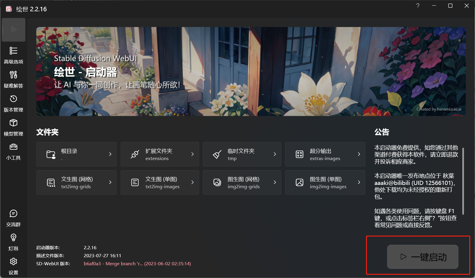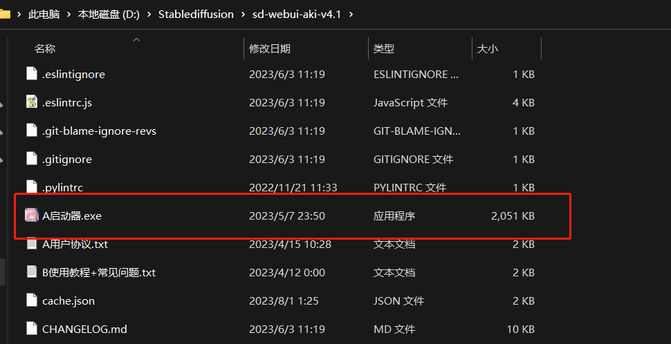 解压 sd-webui-aki-v4 文件夹后,双击打开A启动器 程序即可。
