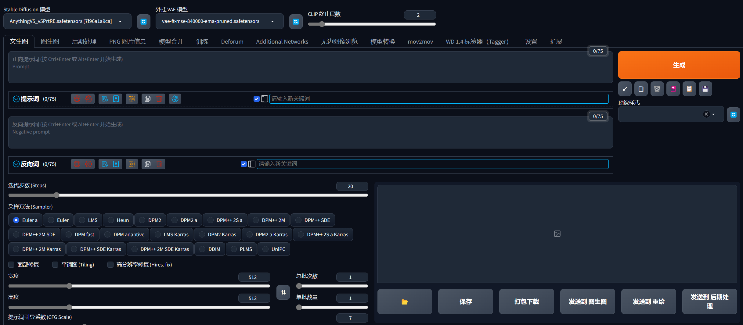 一般会等待十来秒,它就会自动弹出Stable Diffusion 的操作页面!然后在提示词输入框输入你要生成图片的描述,点击生成即可!