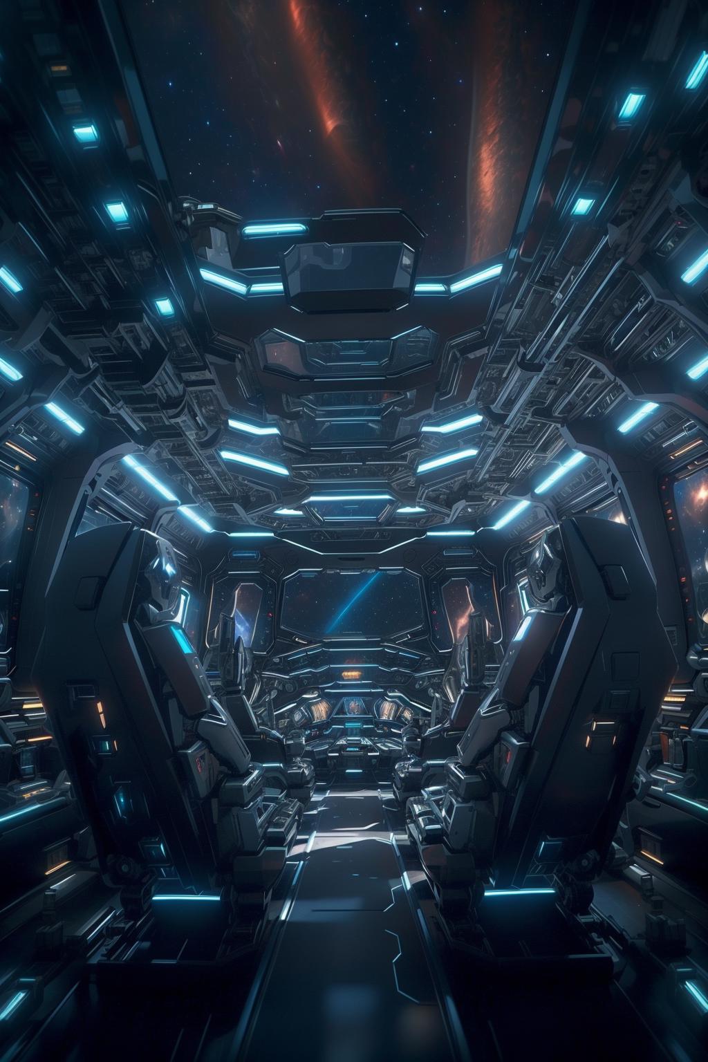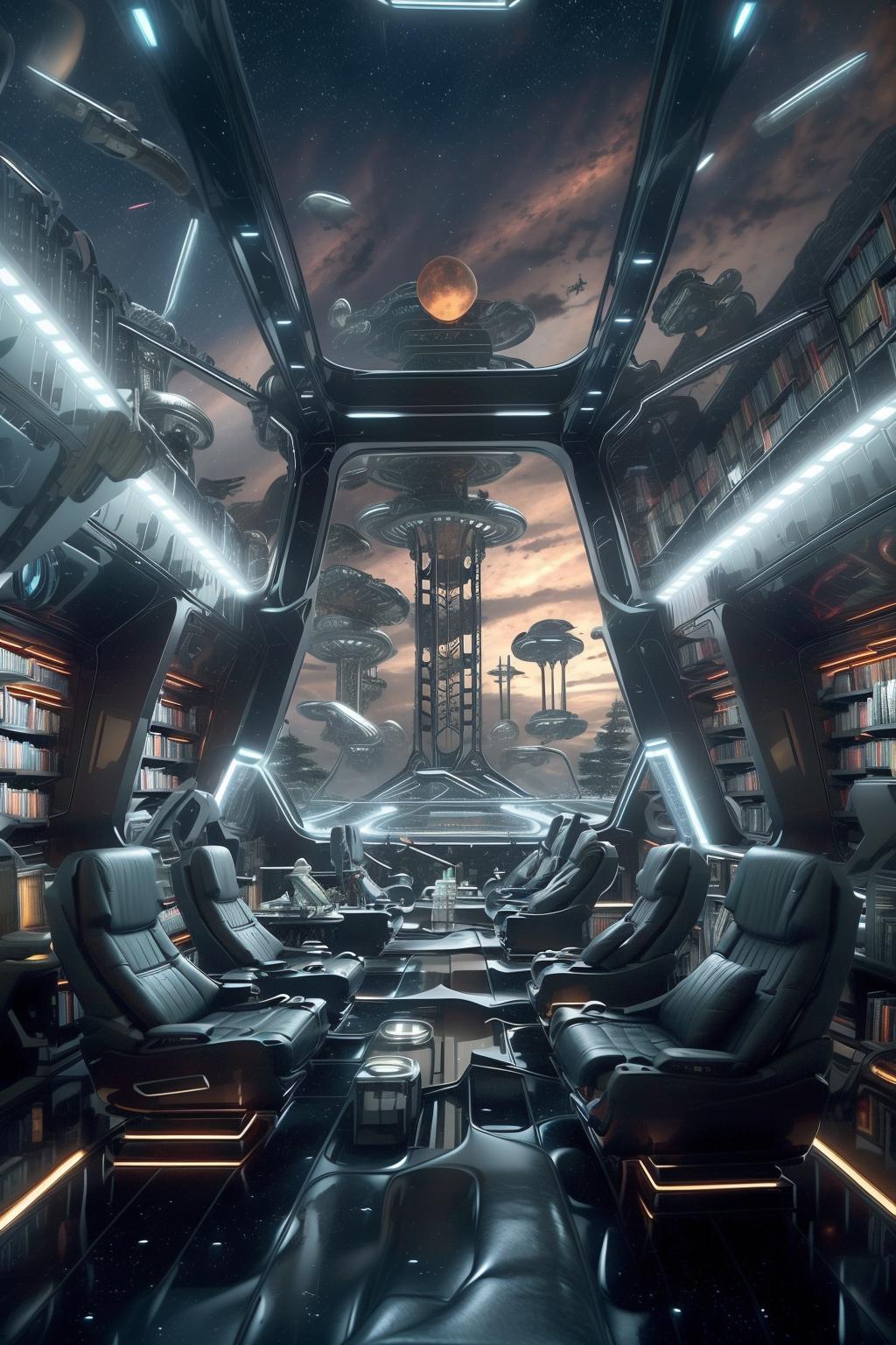 a library with a sofa and book shelves,, (masterpiece),(high quality), best quality, real,(realistic), super detailed, (full detail),(4k),8k,science fiction, no humans, robot, space, mecha, solo, cockpit, glowing, star (sky)<lora:XSArchi_127:1>