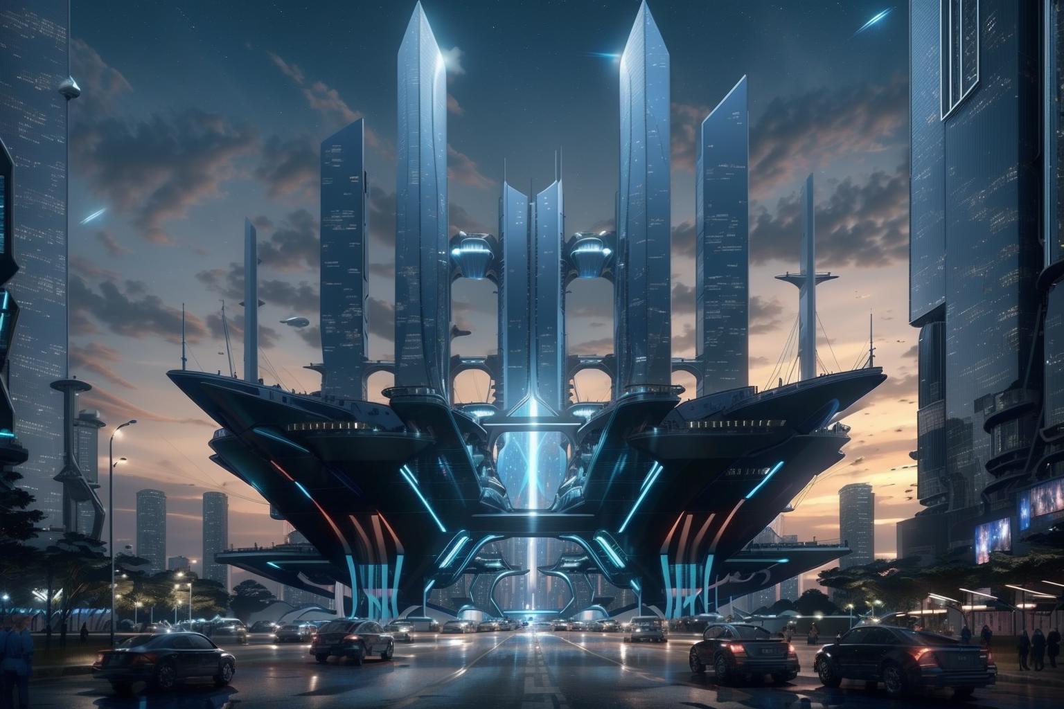 (masterpiece),(high quality), best quality, real,(realistic), super detailed, (full detail),(4k),8k,outside,no humans,night,road, outdoors, building, science fiction,scenery, city,sky, The ship is in the air<lora:XSArchi_127:1>
