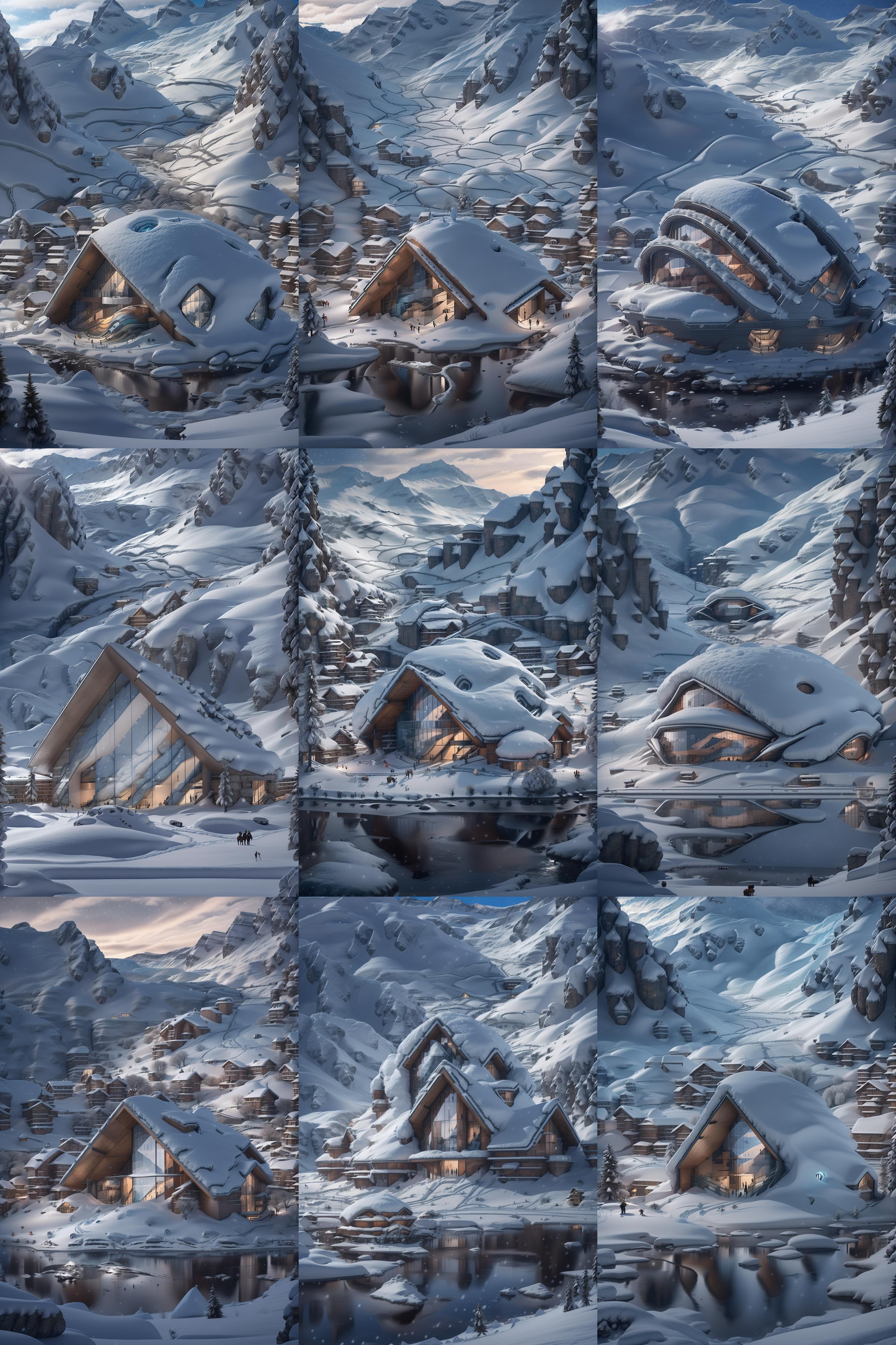 a library with a sofa and book shelves,, (masterpiece),(high quality), best quality, real,(realistic), super detailed, (full detail),(4k),8k,no humans, mountain, snow, outdoors, scenery, reflection, pokemon (creature), window, sky, house, footprints, day, building, tree <lora:XSArchi_127:1>