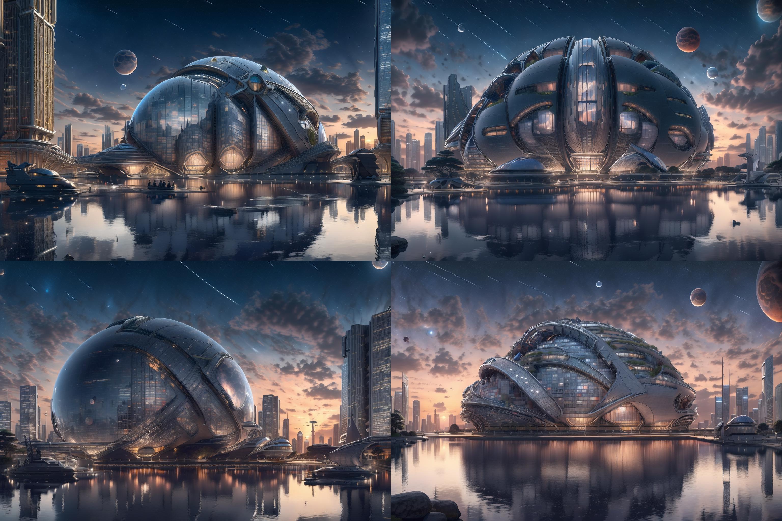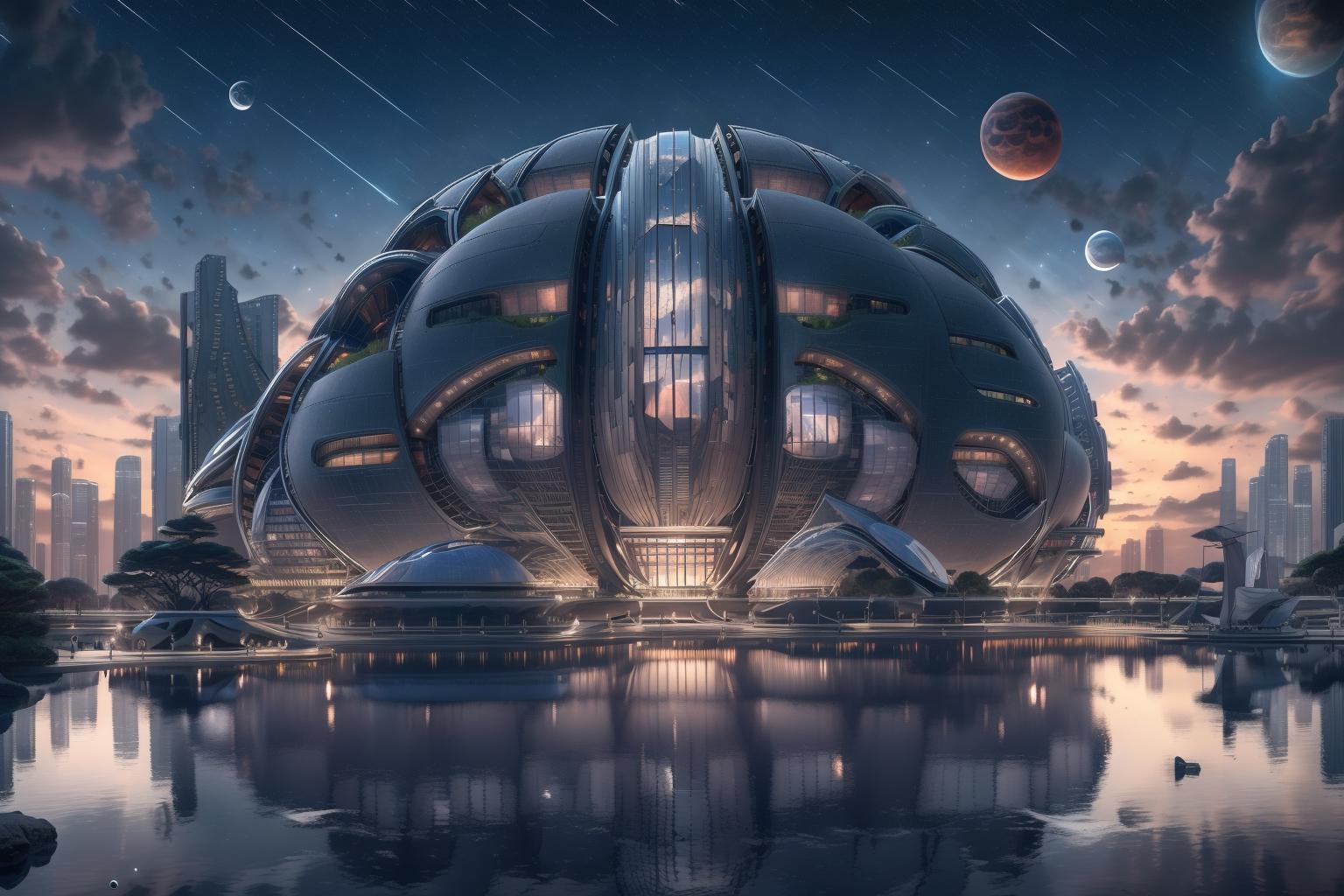 a library with a sofa and book shelves,, (masterpiece),(high quality), best quality, real,(realistic), super detailed, (full detail),(4k),8k,scenery, no humans, reflection, sky, star (sky), cloud, building, planet, outdoors, starry sky, water, city, moon, sunset, night <lora:XSArchi_127:0.9>