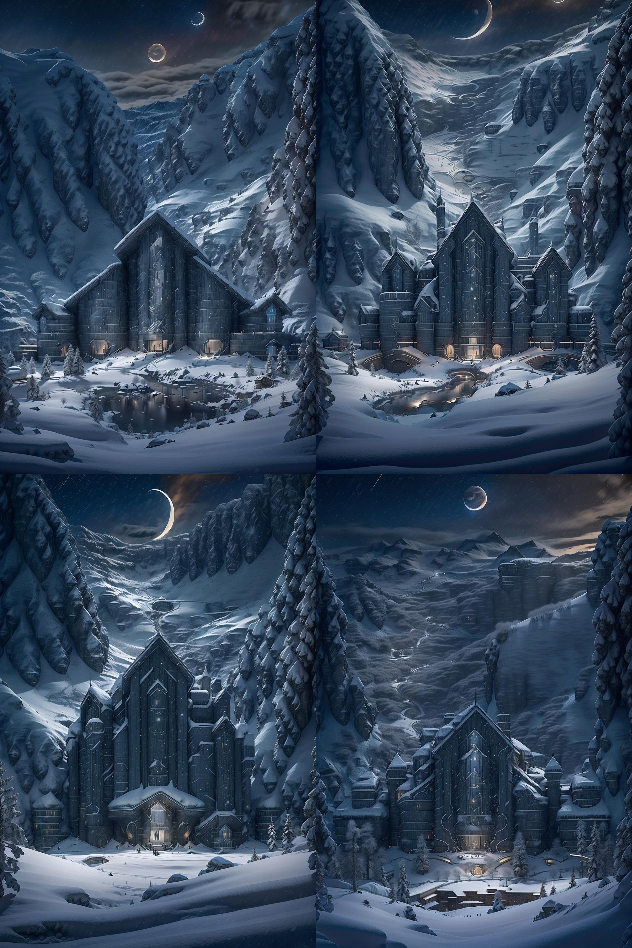 a library with a sofa and book shelves,, (masterpiece),(high quality), best quality, real,(realistic), super detailed, (full detail),(4k),8k,snow, scenery, no humans, mountain, sky, moon, cloud, outdoors, crescent moon, tree, building, border, night, winter, landscape, house, black border, snowing, cloudy sky <lora:XSArchi_127:1>