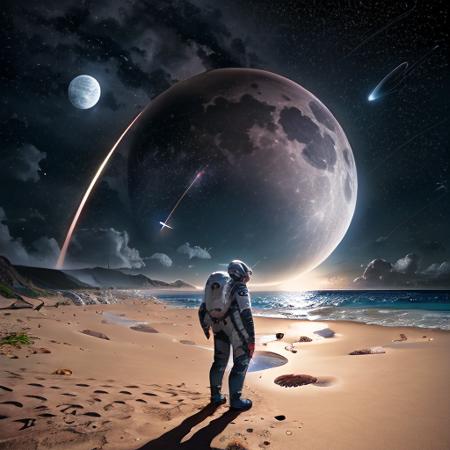 man space traveler stranded, garden, ocean, night, moon, starry sky, 1starfield style, <lora:1starfieldV2:0.7>