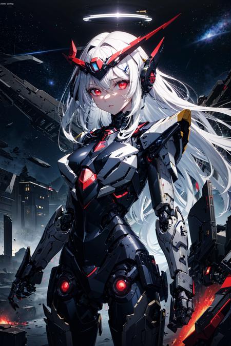 mechanical halo,star halo,intricate mechanical bodysuit, mecha corset, kimono, full armor,