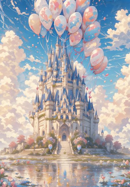 miji, castle, sky, outdoors, cloud, scenery, no humans, flower, balloon, blue sky, day