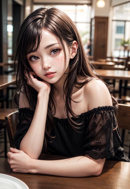 (masterpiece, best quality), (absurdres:1.3), (photorealistic:1.1), beautiful girl, (ultra detailed, ultra realistic, hyper realistic, 8K, ultra highres:1.2), long hair, brown hair, (tilt head, dynamic pose:1.3), solo, slim, slender, (bokeh, sharp focus, depth of field), BREAK <lyco:more_details:0.6>, (high detailed skin, detailed skin texture:1.2), indoor BREAK 1girl, solo, young girl, cute, adorable, (POV dating:1.3), table, cafe, coffee, sitting, off shoulder, resting chin in hands